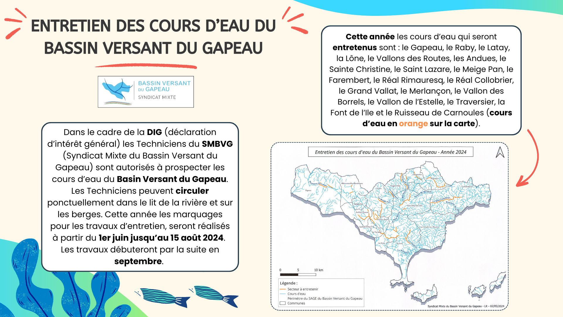 Dans le cadre de la DIG ( déclaration d'intérêt général) les Techniciens du SMBVG (Syndicat Mixte du Bassin Versant du Gapeau) sont autorisés à prospecter les cours d'eau du Bassin Versant du Gapeau.