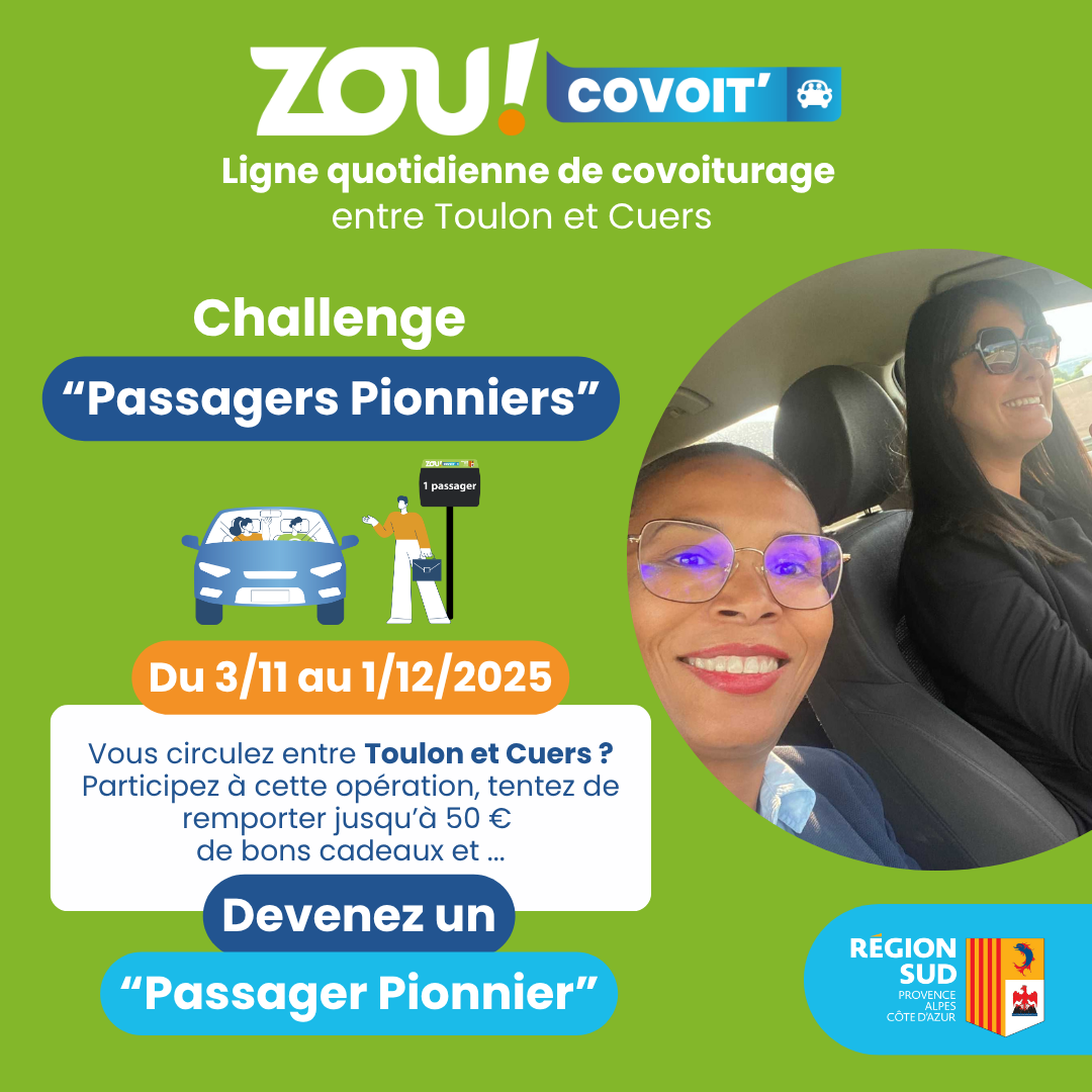 Zou' Covoit organise du 3 novembre au 1er décembre le challenge Passager Pionnier, un mois pour adopter le réflexe covoiturage.