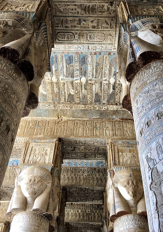 Particulièrement fascinant, le décor de nombreux plafonds présente des images familières, ou plus rares, qu’il convient toujours de déchiffrer en fonction de leur position respective et des connaissances astrologiques de l’époque.