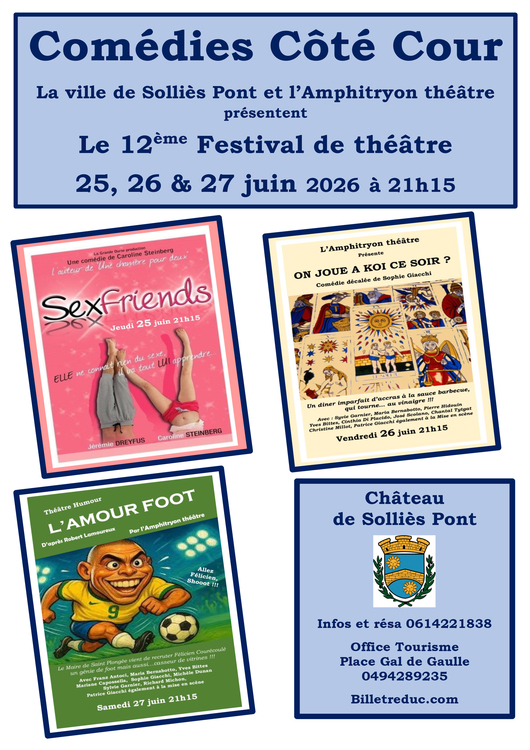 La ville de Solliès-Pont et l'Amphitryon théâtre vous présentent le 12ème festival des Comédies Côté Cour du 25 au 27 juin.
