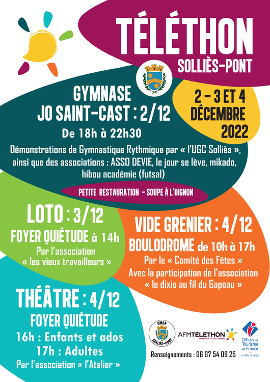 2/12 de 18h à 22h30 : Démonstrations de gymnastique rythmique par "l'UGC Solliès", ainsi que des associations "Devie", "Le jour se lève", "Mikado", "Hibou académie" (futsal) au gymnase Jo St Cast
