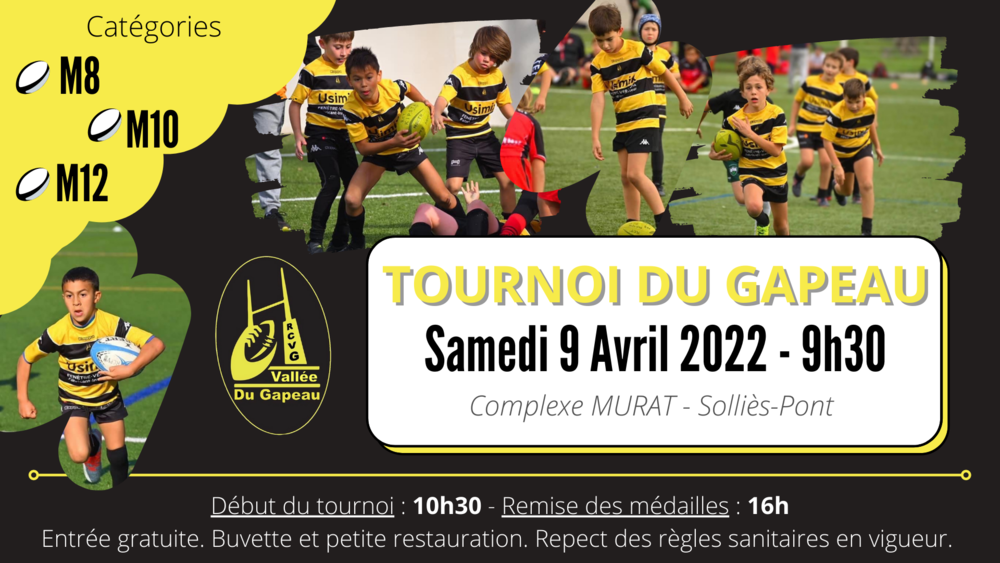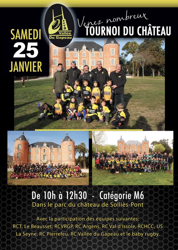 Catégorie M6 Tournoi de rugby organisé par le RCVG rugby club de la Vallée du Gapeau. Samedi 29 Janvier au Parc du Château de 10h à 13h. Participants : enfants âgés de 5 ans et licenciés dans un club de rugby.