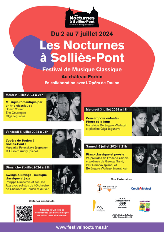 Le festival Les Nocturnes à Solliès-Pont, fondé en 2024, est dirigé par Olga Jegunova, en collaboration avec la Mairie de Solliès-Pont et sous la supervision de son maire, le Dr André Garron. En 2026, le festival propose sa 3e édition, suite au succès et aux excellents retours des premières éditions. Grâce à la présence d'artistes de renom et à un public enthousiaste, le festival affirme progressivement sa propre identité. L'atmosphère chaleureuse du festival crée une forte impression de convivialité. Malgré les différences, les difficultés et les défis du contexte politique, économique, social et écologique actuel, Les Nocturnes unissent, réconfortent et apportent de l'espoir grâce à la musique classique. En 2026, nous sommes extrêmement fiers d'accueillir l'un des plus grands musiciens contemporains, le pianiste Christian Zacharias. Il donnera deux concerts : un récital solo et un concert de musique de chambre avec des artistes de Toulon et de Monaco. Grâce au concert du Petit Prince avec Pierrick Grillet, au spectacle Ti-Train et au concert des élèves de Conservatoire TPM nous invitons les jeunes générations et les familles à venir apprécier la musique classique à travers des contes et du théâtre, de manière très accessible et légère. Le tout nouveau spectacle de piano et mime, avec Benoît Turjman, vous charmera à coup sûr, et la soirée de clôture du chant lyrique offrira une magnifique conclusion au Festival, avec des étoiles montantes comme Kaarin Cecilia Phelps et Emmanuelle Demuyter. Nous vous invitons à la 3e édition du Festival de musique classique Les Nocturnes à Sollies-Pont, qui se déroulera du 30 juin au 4 juillet au château Forbin et à la Médiathèque. Nous espérons vous voir nombreux à tous nos concerts !